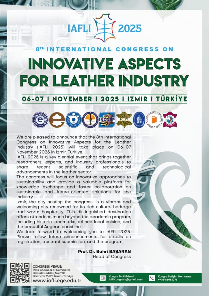 × Duyuru Görüntüleme KONGRE 8. ULUSLARARASI IAFLI (INNOVATIVE ASPECTS FOR LEATHER INDUSTRY) KONGRESİ TARİH / SAAT : 06-07 Kasım 2025 / 09.00 YER : İzmir Ticaret Odası Konferans Salonu DÜZENLEYEN : EÜ Mühendislik Fakültesi Deri Mühendisliği Bölümü GOOGLE TAKVİME EKLE ( Google Takvim Kullananlar için)