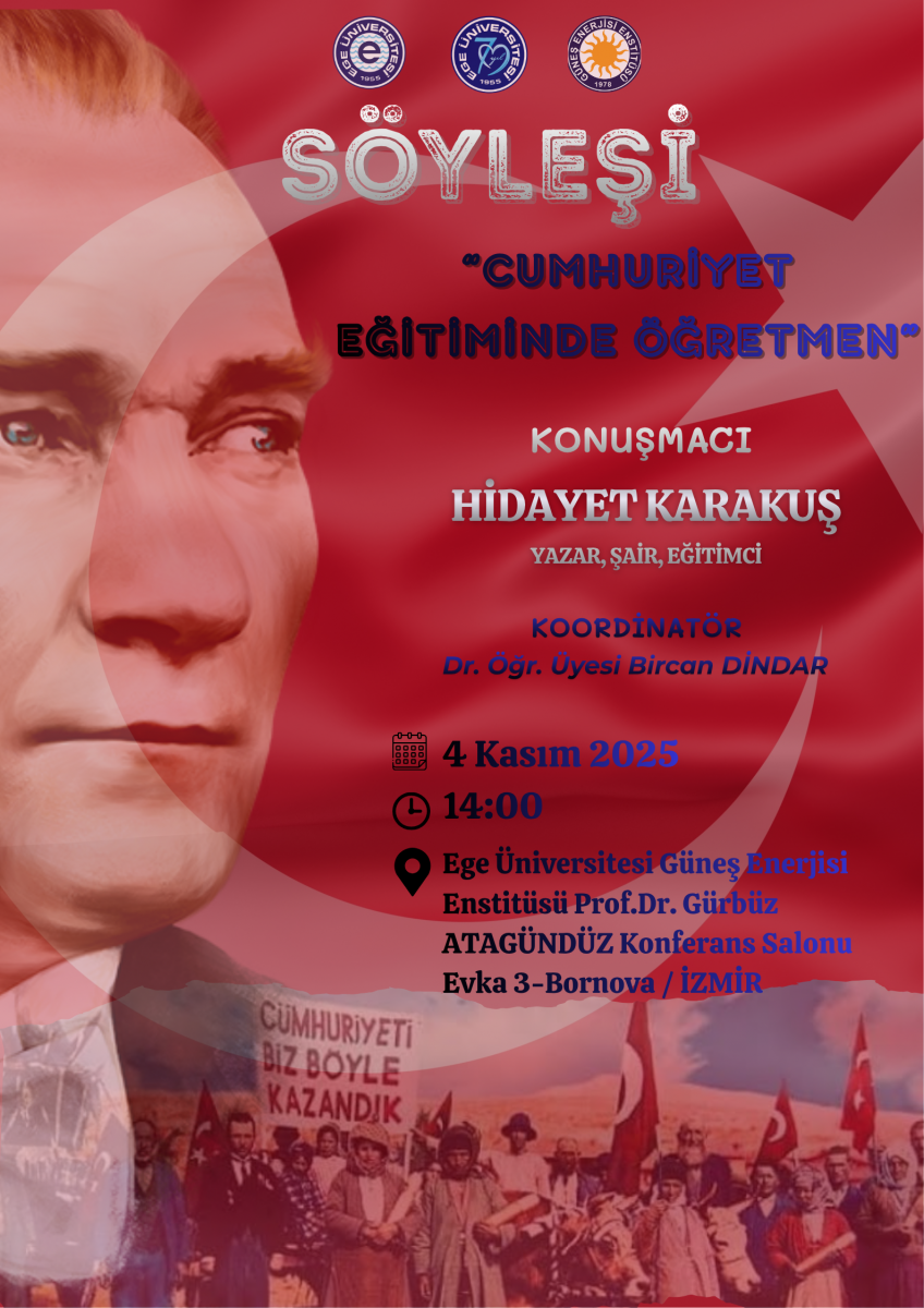 × Duyuru Görüntüleme SÖYLEŞİ CUMHURİYET EĞİTİMİNDE ÖĞRETMEN Hidayet KARAKUŞ Yazar, Şair, Eğitimci TARİH / SAAT : 04 Kasım2025 / 14.00 YER : EÜ Güneş Enerjisi Enstitüsü Prof. Dr. Gürbüz ATAGÜNDÜZ Konferans Salonu DÜZENLEYEN : EÜ Güneş Enerjisi Enstitüsü GOOGLE TAKVİME EKLE ( Google Takvim Kullananlar için)