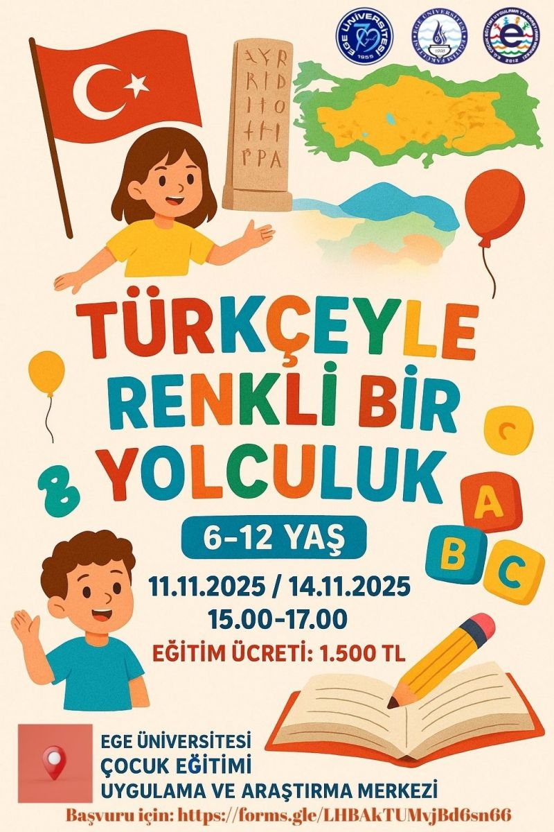 × Duyuru Görüntüleme ATÖLYE TÜRKÇEYLE RENKLİ BİR YOLCULUK 6-12 YAŞ TARİH / SAAT : 11-14 Eylül 2025 / 15.00 YER :EÜ Çocuk Eğitimi UAM (Kampüs Şelale karşısı – konum ) DÜZENLEYEN : EÜ Çocuk Eğitimi Uygulama ve Araştırma Merkezi BAŞVURU LİNKİ : https://forms.gle/JbuRrGgwk5ePEreXA GOOGLE TAKVİME EKLE ( Google Takvim Kullananlar için)