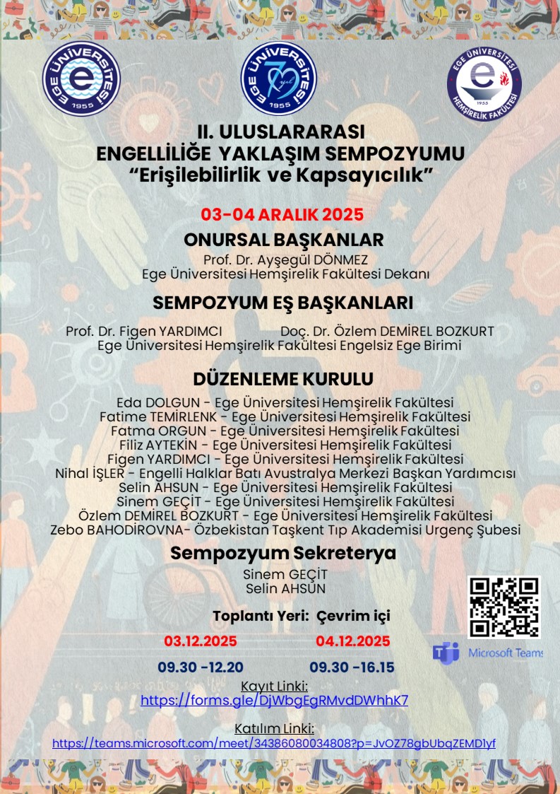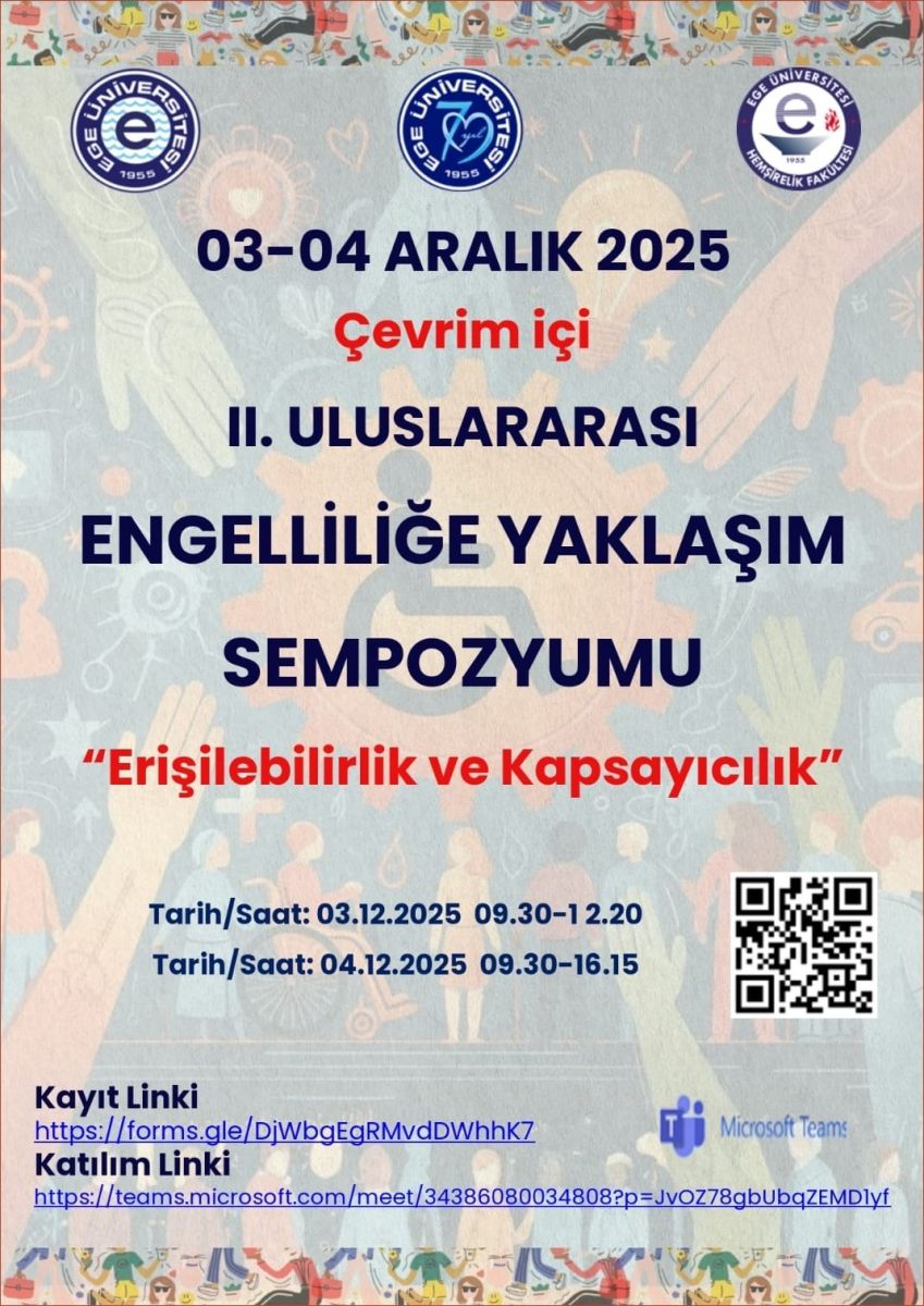 × Duyuru Görüntüleme SEMPOZYUM II. ULUSLARARASI ENGELLİLİĞE YAKLAŞIM SEMPOZYUMU Etkinlik Sayfası ve Detaylı Bilgi için tıklayınız: /dosyalar/20251203-hemsirelik.pdf TARİH : 03-04 Aralık 2025 / 09.30 YER : Çevrimiçi DÜZENLEYEN : EÜ Hemşirelik Fakültesi GOOGLE TAKVİME EKLE ( Google Takvim Kullananlar için)
