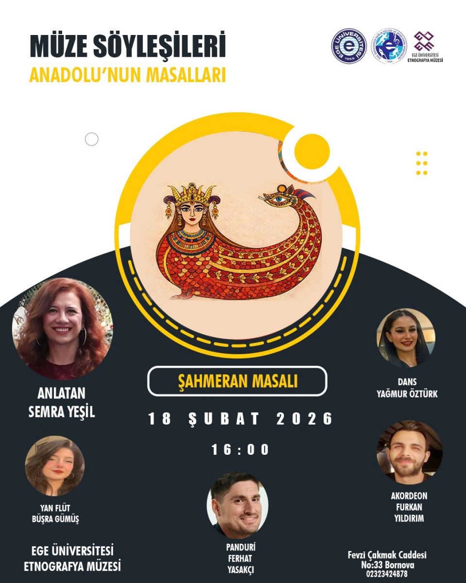 × Duyuru Görüntüleme SÖYLEŞİ ŞAHMERAN MASALI TARİH / SAAT : 18 Şubat 2026/ 16.00 YER : EÜ Etnografya Müzesi DÜZENLEYEN : EÜ SKSDB (Etnografya Müzesi) GOOGLE TAKVİME EKLE ( Google Takvim Kullananlar için)