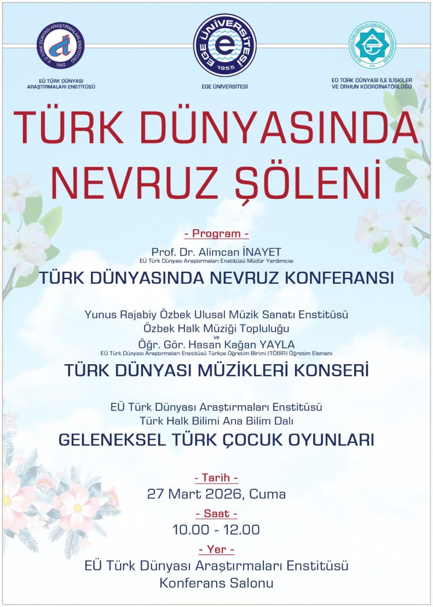 × Duyuru Görüntüleme ŞÖLEN TÜRK DÜNYASINDA NEVRUZ ŞÖLENİ TARİH / SAAT : 27 Mart 2026 /10.00 YER : EÜ Türk Dünyası Araştırmaları Enstitüsü Konferans Salonu DÜZENLEYEN : EÜ Türk Dünyası Araştırmaları Enstitüsü ve Türk Dünyası İle İlişkiler ve Orhun Koordinatörlüğü GOOGLE TAKVİME EKLE ( Google Takvim Kullananlar için)
