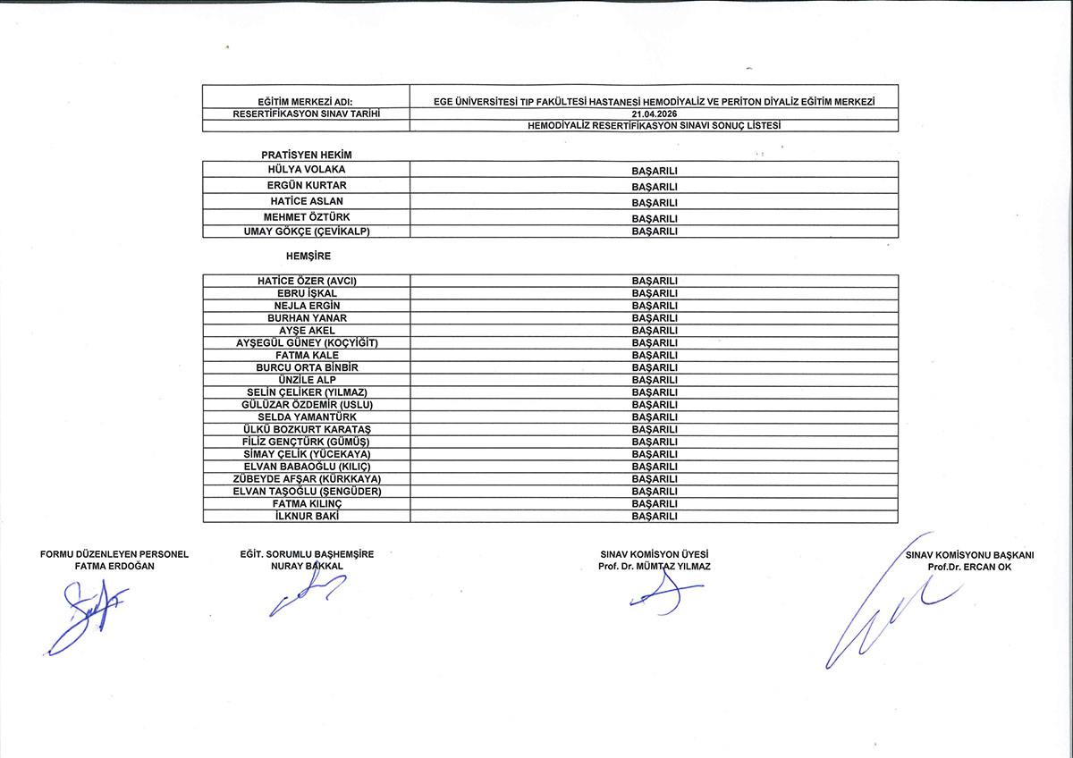 Ege Üniversitesi Tıp Fakültesi Hastanesi tarafından 21.04.2026 tarihinde düzenlenen Hemodiyaliz Hekimliği, Hemodiyaliz Hemşireliği ve Periton Diyaliz Hemşireliği Resertifikasyon Sınavı Sonuçları